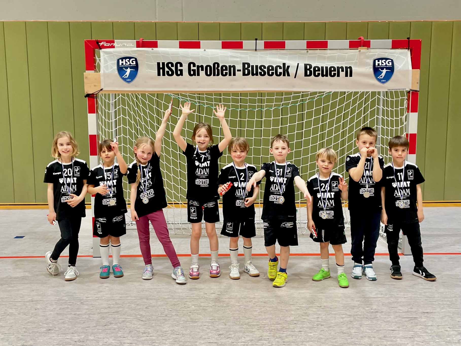 Im Anschluss traten unsere MIDIS gemeinsam mit den Mannschaften der HSG Großen-Buseck/Beuern I & II, der HSG L-Klein-Linden und der HSG Lumdatal an zum Turnier an. Unter dem tosenden Applaus begeisterter Eltern, Großeltern und Geschwisterkinder liefen die Kinder zusammen ein und absolvierten ein gemeinsames Aufwärmen.